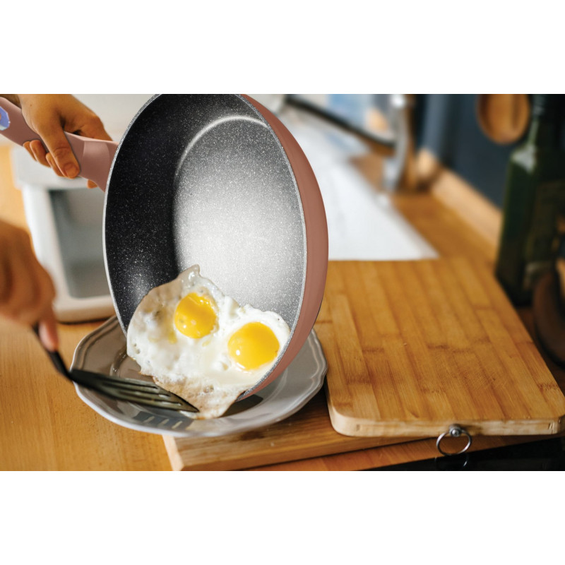Granitowa powłoka sprawia, że naczynia są wyjątkowo odporne na wszelkie zarysowania i trwałe. Ten typ garnków i patelni pozwala również na smażenie przy użyciu minimalnej ilości tłuszczu, ponieważ naczynie rozgrzewa się podobnie do kamienia i oddaje ciepło całą swą powierzchnią.