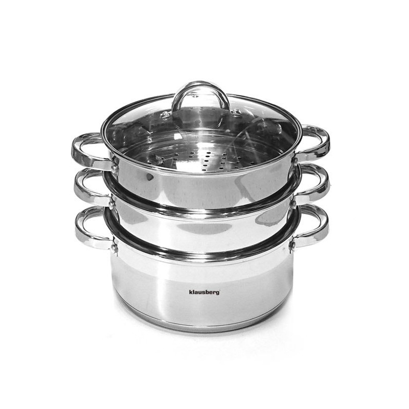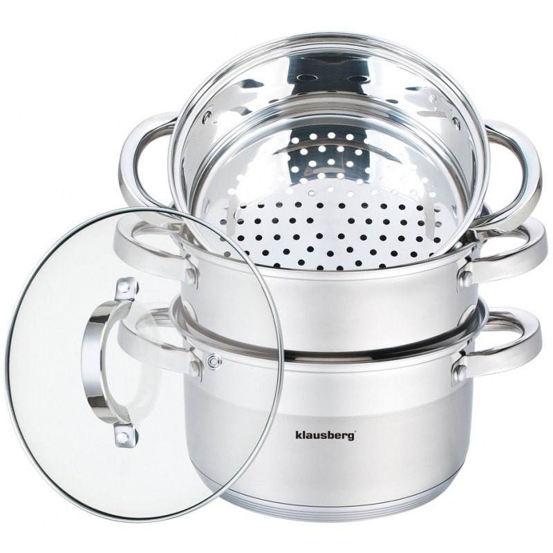 4 częściowy komplet garnków do gotowania na parze KLAUSBERG bazujący na garnku 2.5L / Ø18cm. Zestaw wykonany z wysokiej jakości stali nierdzewnej. Wykorzystana stal składa się z najlepszej jakości stopu powszechnie stosowanego w światowej klasy produktach, co gwarantuje jej wysoką odporność na korozję oraz bardzo dobrą wytrzymałość. Zastosowany materiał umożliwia szybkie podgrzanie potraw i przez dłuższy czas utrzymuje ciepło.