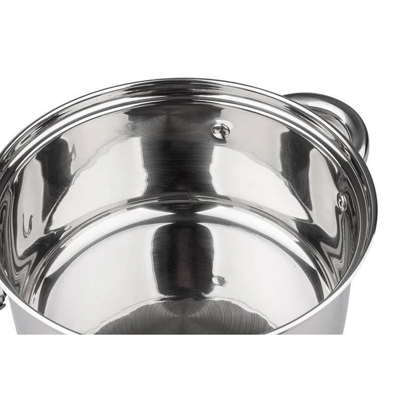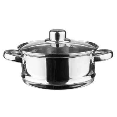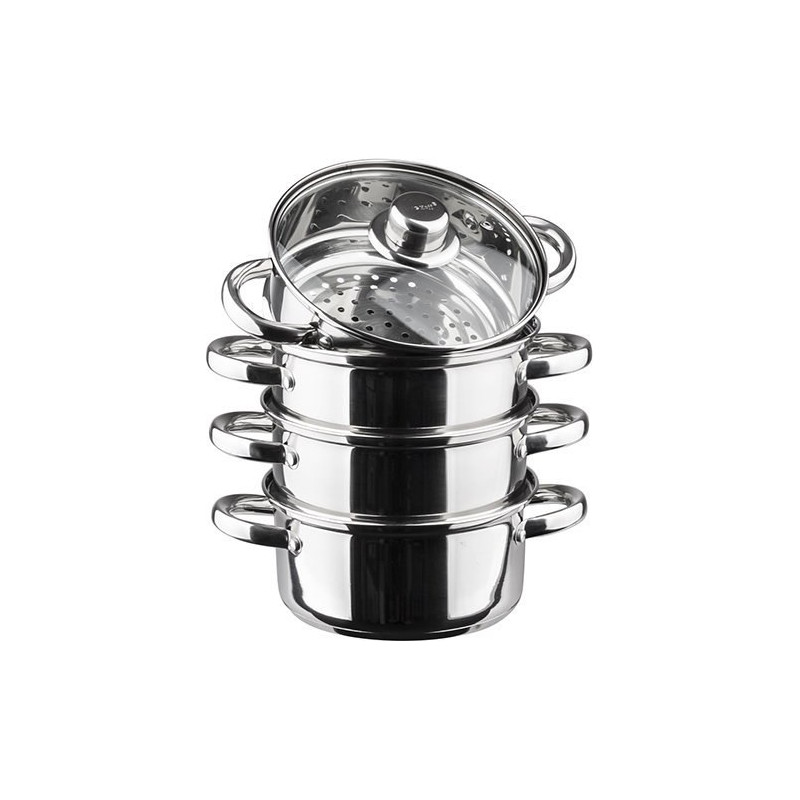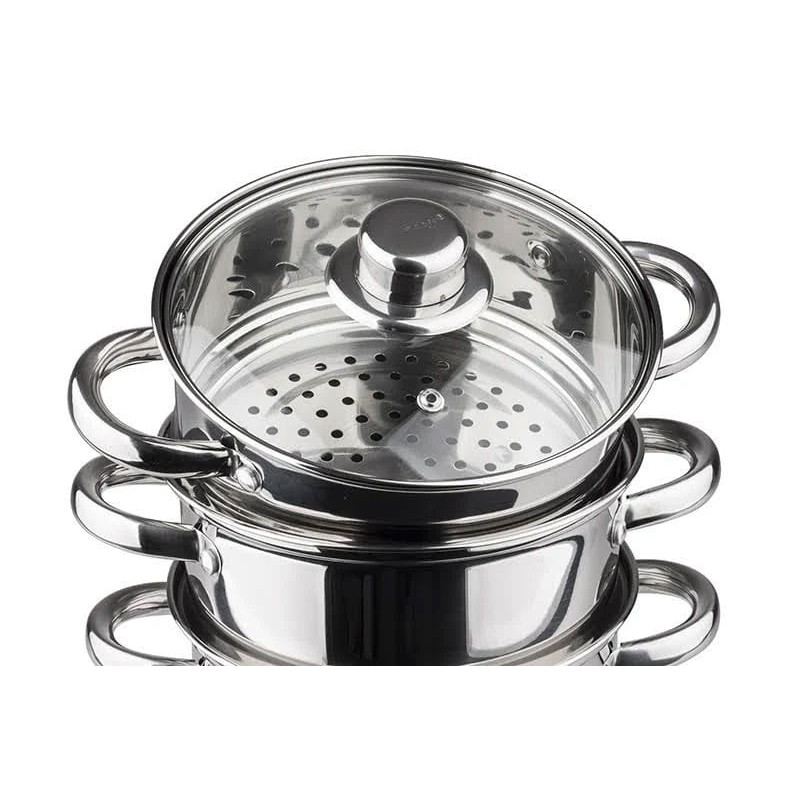 ZESTAW DO GOTOWANIA NA PARZE o łącznej objętości ok. 15L składający się z 5 ELEMENTÓW (GARNEK 5.0L + 3 PAROWNIKI 3.5L + POKRYWKA), wykonany ze stali nierdzewnej 18/8. Uchwyty mocowane za pomocą nitów.