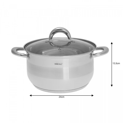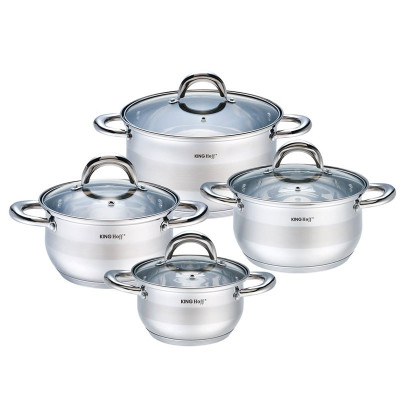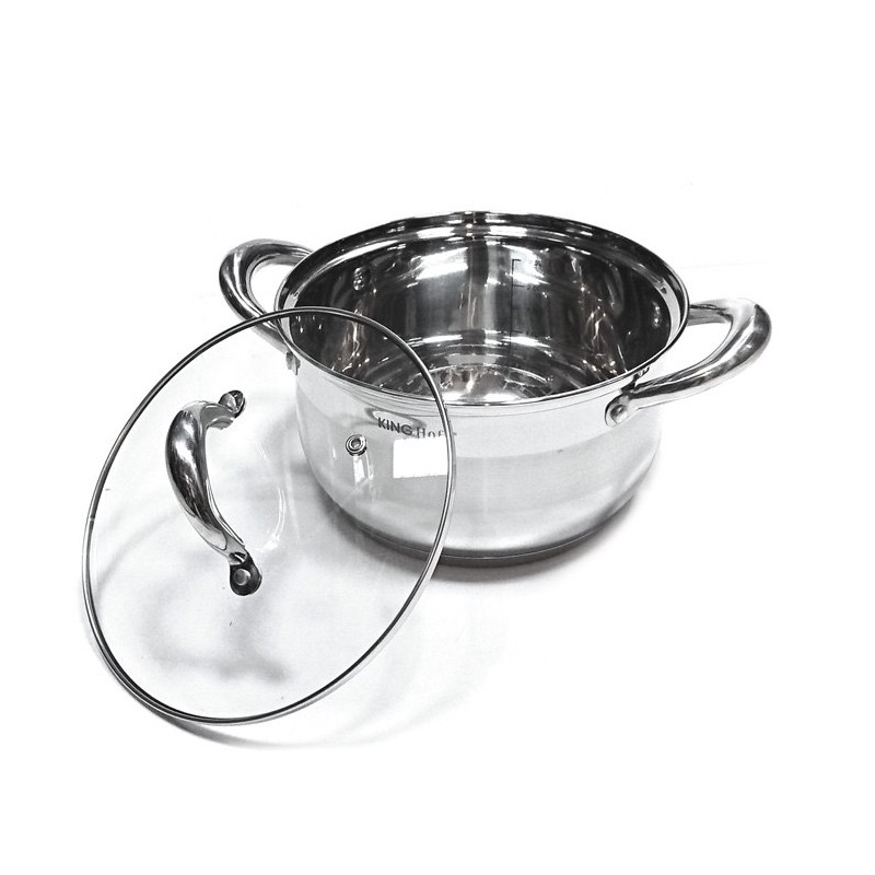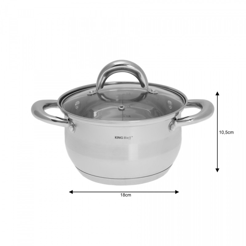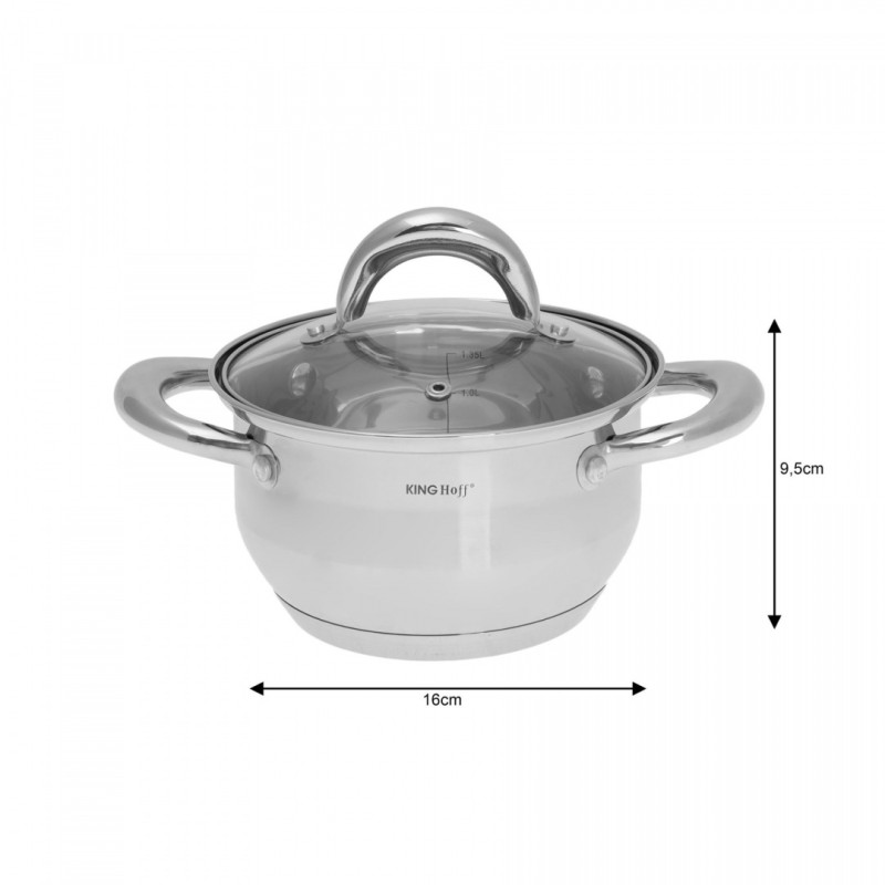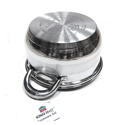 KOMPLET GARNKÓW 8 ELE. KINGHOFF. Stal nierdzewna chromowo-niklowa z której wykonany jest cały komplet jest nierdzewna, wytrzymała i długowieczna. Zastosowany materiał jest nie tyko najlepszy z możliwych, ale także świetnie się prezentuje i jest wyjątkowo łatwy w czyszczeniu oraz posiada właściwości bakteriobójcze. Naczynia w tym komplecie posiadają matowy pasek w środku (INOX). Wnętrze polerowane. Ferromagnetyczne 5-warstwowe dno akutermiczne (5mm) z warstwą aluminiową gwarantuje doskonały rozdział i magazynowanie ciepła. Wszystkie garnki z kompletu można używać na wszystkich rodzajach kuchenek, również nakuchni indukcyjnej. Nitowane uchwyty (polerowane). Na wewnętrznej stronie każdego garnka znajduje się praktyczna miarka. Przyzwoite, umiarkowanie ciężkie garnki działające na indukcji, za bardzo atrakcyjną cenę.