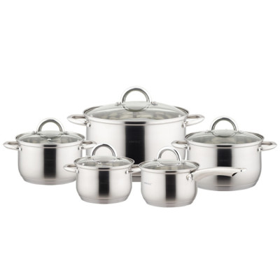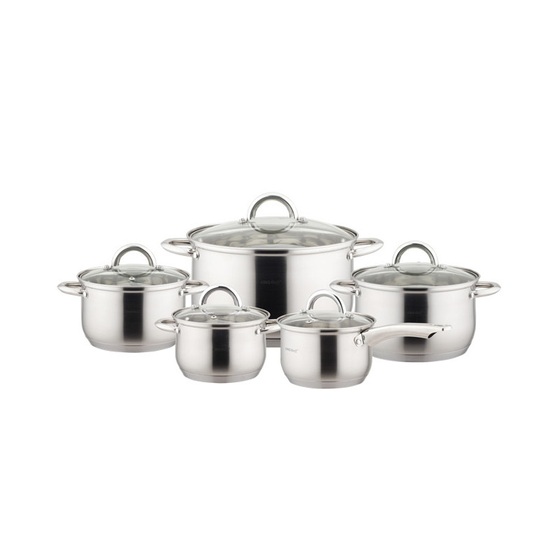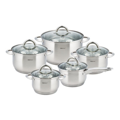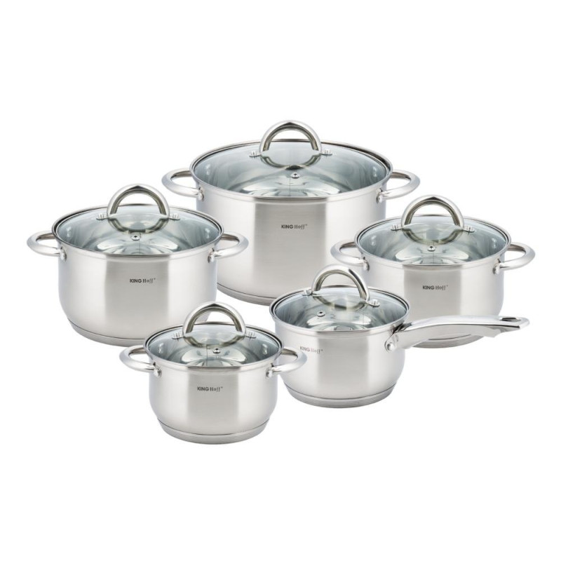 KOMPLET GARNKÓW 10 ELE. KINGHOFF . Komplet wykonany ze stali chromowo-niklowej 18/10. Stal nierdzewna chromowo-niklowa z której wykonany jest cały komplet jest nierdzewna, wytrzymała i długowieczna. Zastosowany materiał jest nie tyko najlepszy z możliwych, ale także świetnie się prezentuje i jest wyjątkowo łatwy w czyszczeniu oraz posiada właściwości bakteriobójcze. Naczynia w tym komplecie są delikatnie matowane (INOX). Ferromagnetyczne 5-warstwowe dno akutermiczne (5mm) z warstwą aluminiową gwarantuje doskonały rozdział i magazynowanie ciepła. Wszystkie garnki z kompletu można używać na wszystkich rodzajach kuchenek, również nakuchni indukcyjnej. Nitowane uchwyty (polerowane). Na wewnętrznej stronie każdego garnka znajduje się praktyczna miarka. Przyzwoite, umiarkowanie ciężkie garnki działające na indukcji, za bardzo atrakcyjną cenę.