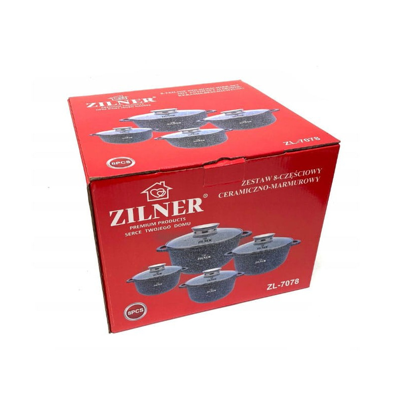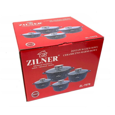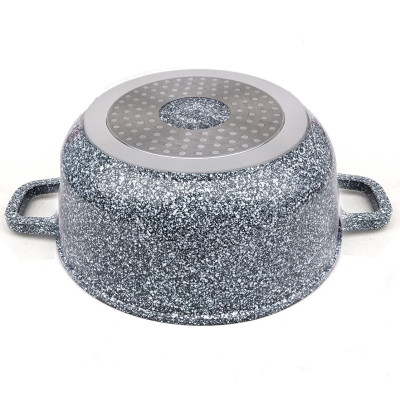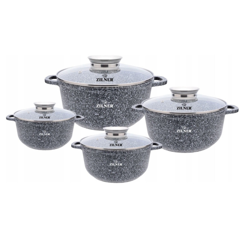 8 elementowe garnki wykonane z odlewanego stopu aluminiowego z anty-przywierającą powłoką z domieszką miału granitowego (imitującą marmur) wykonaną w procesie nanotechnologii tworząc niezwykle gęstą, zwartą oraz gładką warstwę na powierzchni.