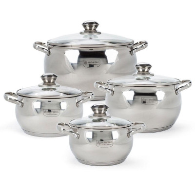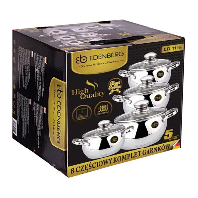 Zestaw 4 garnków stalowych EDENBERG. Komplet wykonany z wysokiej jakości stali nierdzewnej chromowo-niklowej. Naczynia w tym komplecie są obustronnie polerowane. Pokrywki szklane z odpowietrznikiem.