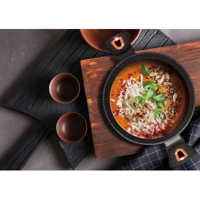 Kompozycja aluminiowego korpusu i ferromagnetycznego dna umożliwia użytkowanie na kuchni indukcyjnej oraz na wszystkich innych rodzajach kuchni i wykorzystywania najlepszych właściwości akutermicznych odlewanego i kutego aluminium na wszystkich kuchenkach i płytach grzewczych. Możliwość gotowania/smażenia w temperaturze do 220°C.