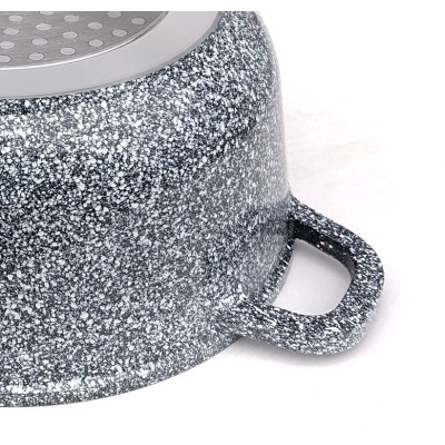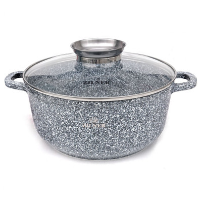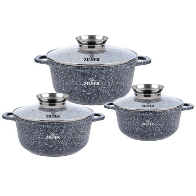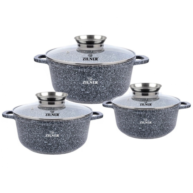 Komplet 3 garnków ZILNER pokrytych ceramiczno marmurową powłoką nieprzywierającą. Zestaw posiada pokrywki szklane z uchwytem Aroma Knob w którym umieszczono dozownik oleju, dzięki któremu podczas gotowania lub duszenia można podawać olej lub płynne przyprawy. Garnki wykonane ze stopu aluminium posiadają indukcyjne ferromagnetyczne dno. Są przystosowane do współpracy z każdym rodzajem kuchni, włącznie z indukcyjną.