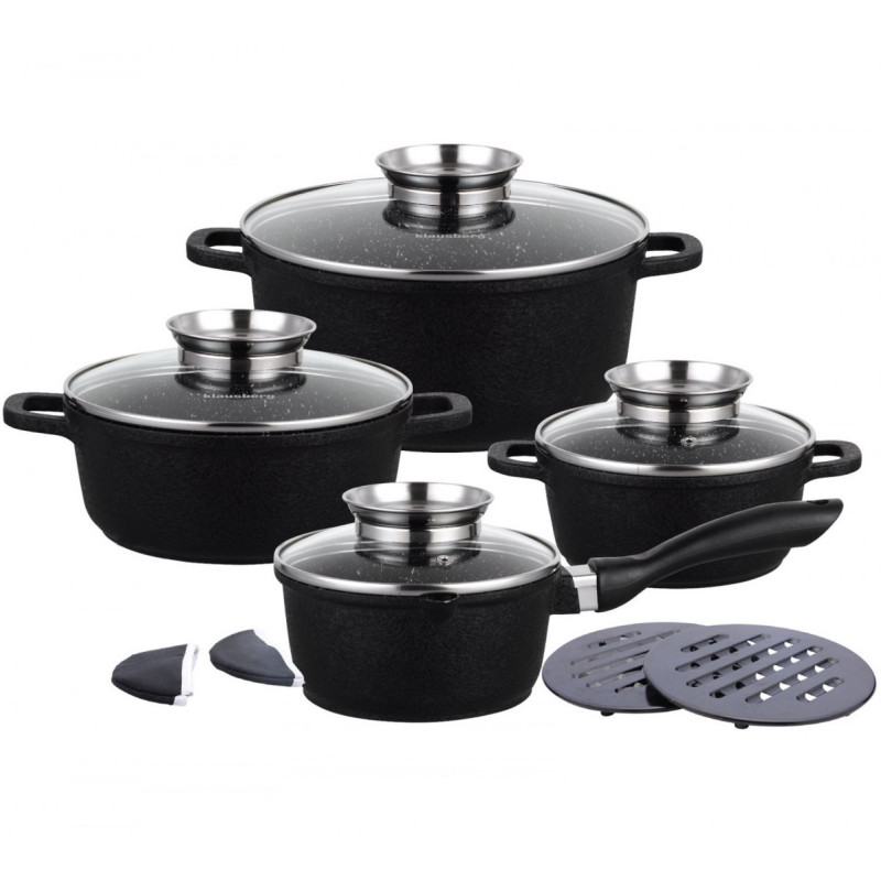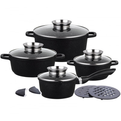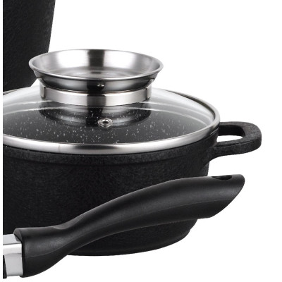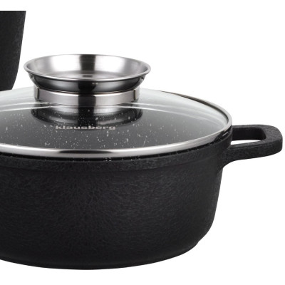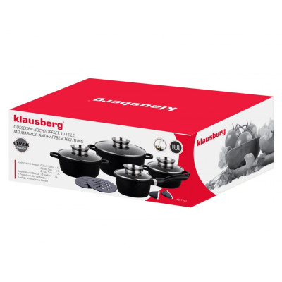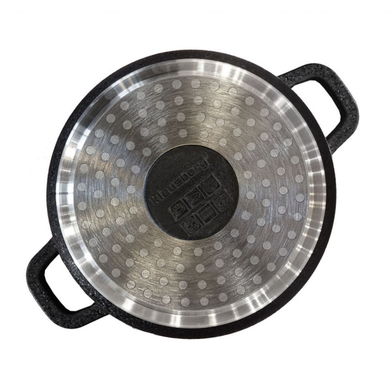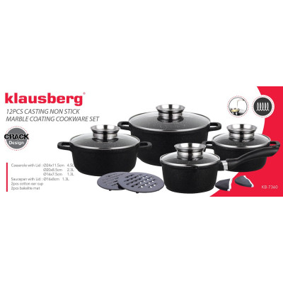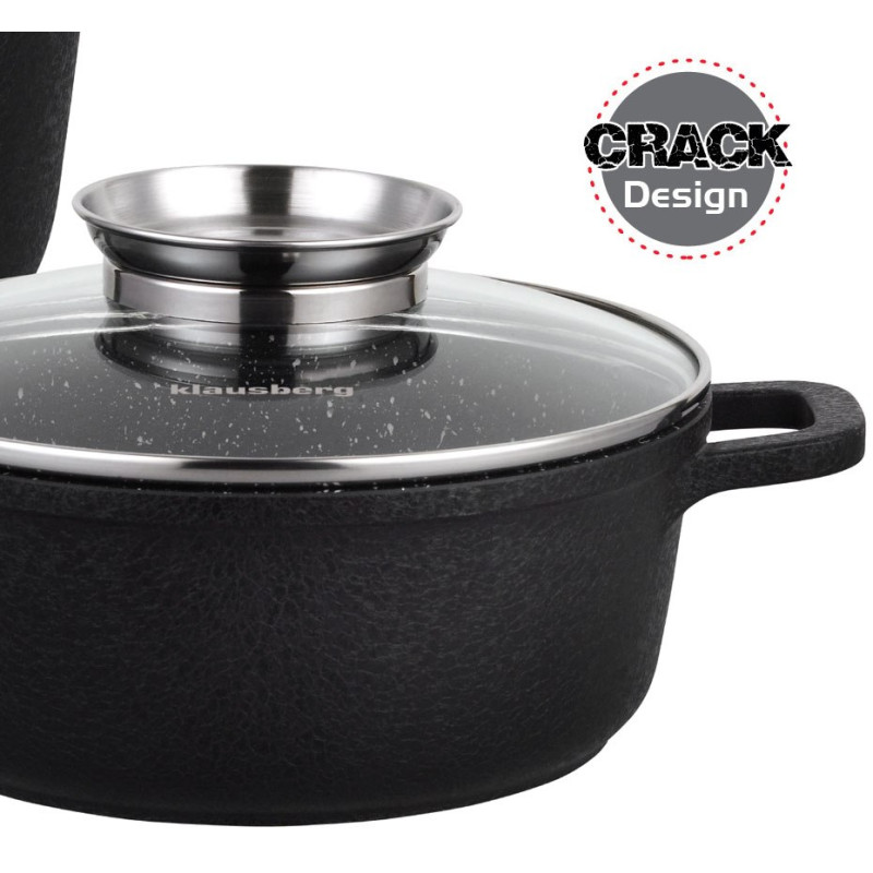 Komplet 4 garnków KLAUSBERG pokrytych granitową powłoką nieprzywierającą (12 elementów). Z zewnątrz pokryte powłoką o porowatej, spękanej strukturze (Crack Design). Daje to ciekawy efekt wizualny. Wyposażony w pokrywki szklane z uchwytem Aroma Knob w którym umieszczono dozownik oleju, dzięki któremu podczas gotowania lub duszenia można podawać olej lub płynne przyprawy. Garnki wykonane ze stopu aluminium posiadają indukcyjne ferromagnetyczne dno. Są przystosowane do współpracy z każdym rodzajem kuchni, włącznie z indukcyjną.