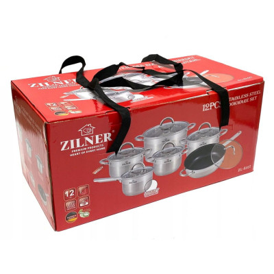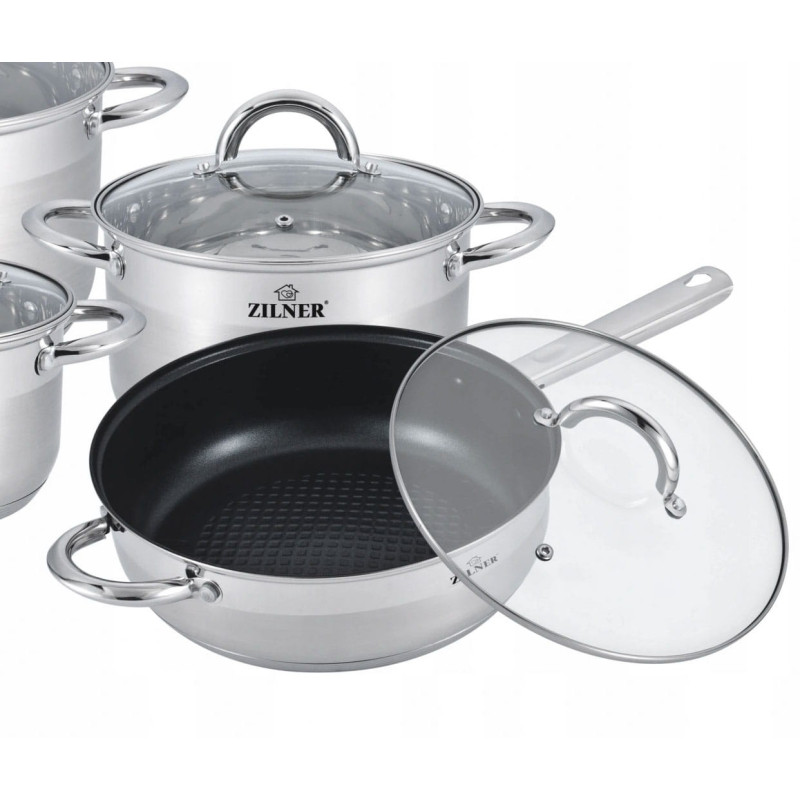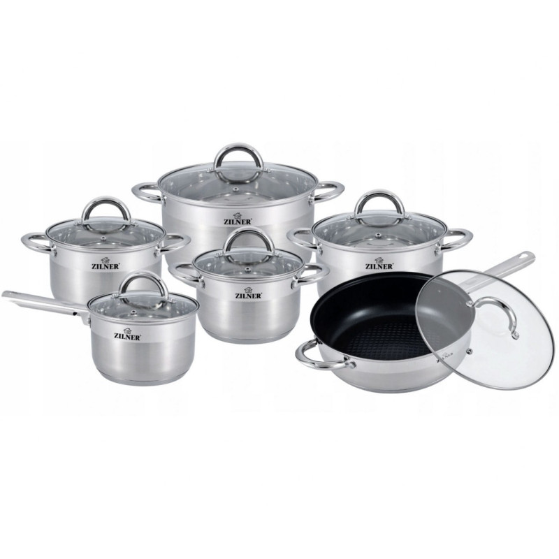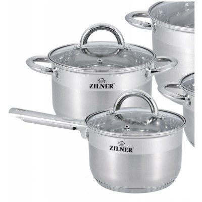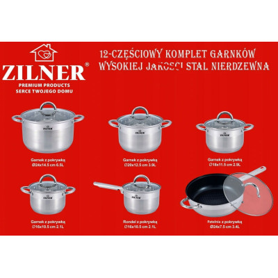 12 częściowy komplet garnków firmy ZILNER wykonany ze stali nierdzewnej. Stal chromowo-niklowa z której wykonany jest cały komplet jest nierdzewna, wytrzymała i długowieczna. Zastosowany materiał jest nie tyko najlepszy z możliwych, ale także świetnie się prezentuje i jest wyjątkowo łatwy w czyszczeniu oraz posiada właściwości bakteriobójcze. Naczynia w komplecie są z zewnątrzdelikatnie matowane do ok. 3/4 wysokości (INOX) oraz błyszczące wewnątrz. Ferromagnetyczne 5-warstwowe dno akutermiczne (5mm) z warstwą aluminiową gwarantuje doskonały rozdział i magazynowanie ciepła. Wszystkie garnki z kompletu można używać na wszystkich rodzajach kuchenek, również nakuchni indukcyjnej. Nitowane uchwyty (polerowane). Na wewnętrznej stronie każdego garnka znajduje się praktyczna miarka. Przyzwoite, umiarkowanie ciężkie garnki działające na indukcji, za bardzo atrakcyjną cenę.
