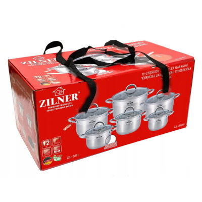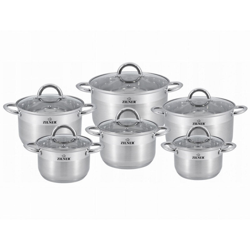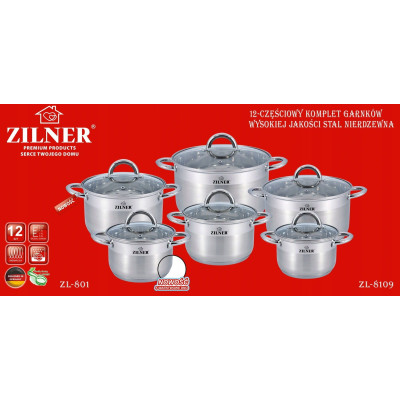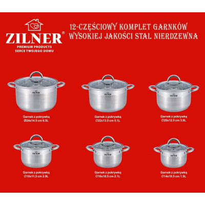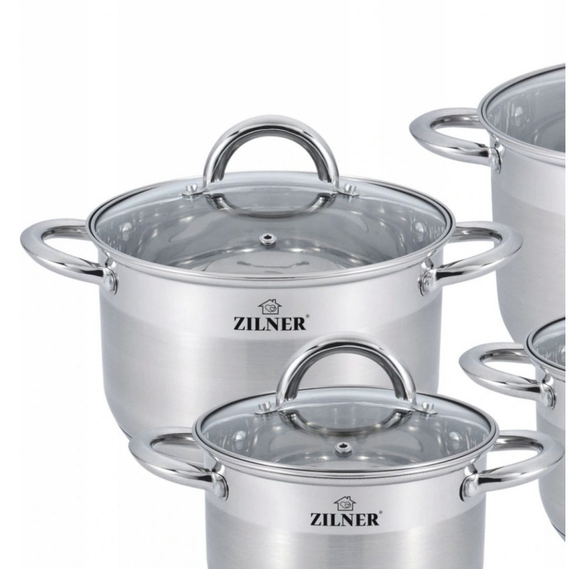 12 częściowy komplet garnków firmy ZILNER wykonany ze stali nierdzewnej. Stal chromowo-niklowa z której wykonany jest cały komplet jest nierdzewna, wytrzymała i długowieczna. Zastosowany materiał jest nie tyko najlepszy z możliwych, ale także świetnie się prezentuje i jest wyjątkowo łatwy w czyszczeniu oraz posiada właściwości bakteriobójcze. Naczynia w komplecie są z zewnątrzdelikatnie matowane do ok. 3/4 wysokości (INOX) oraz błyszczące wewnątrz. Ferromagnetyczne 5-warstwowe dno akutermiczne (5mm) z warstwą aluminiową gwarantuje doskonały rozdział i magazynowanie ciepła. Wszystkie garnki z kompletu można używać na wszystkich rodzajach kuchenek, również nakuchni indukcyjnej. Nitowane uchwyty (polerowane). Na wewnętrznej stronie każdego garnka znajduje się praktyczna miarka. Przyzwoite, umiarkowanie ciężkie garnki działające na indukcji, za bardzo atrakcyjną cenę.