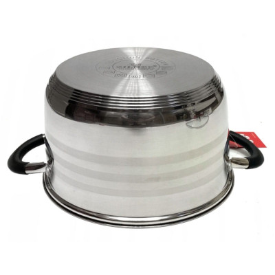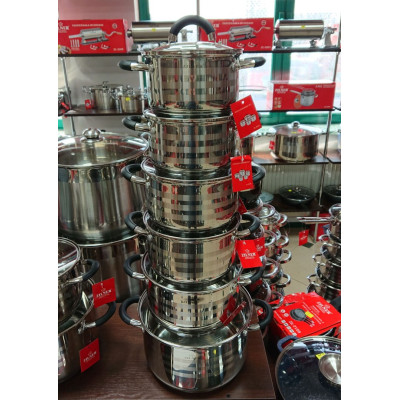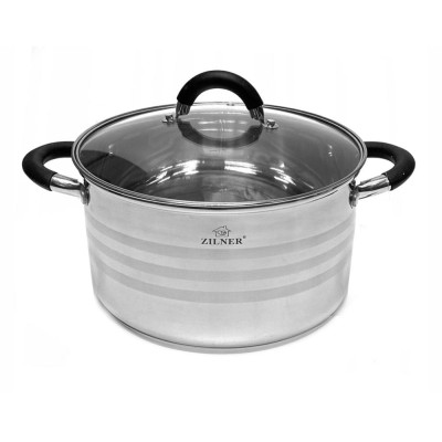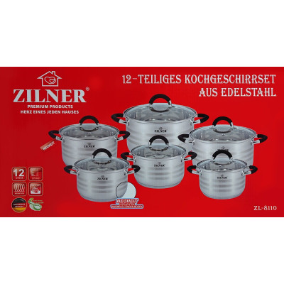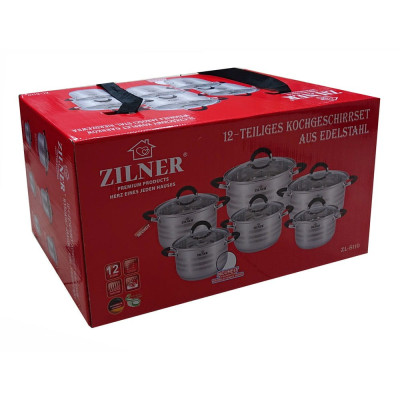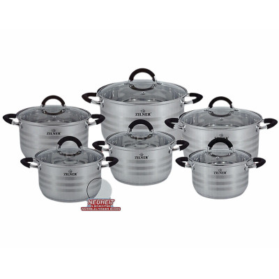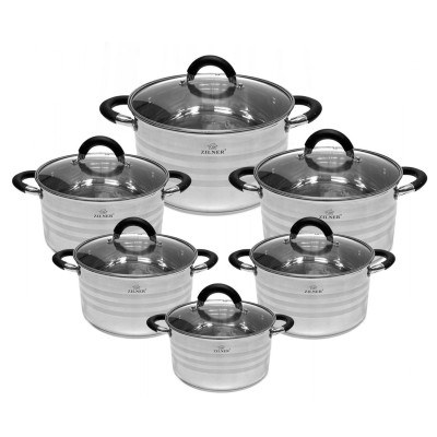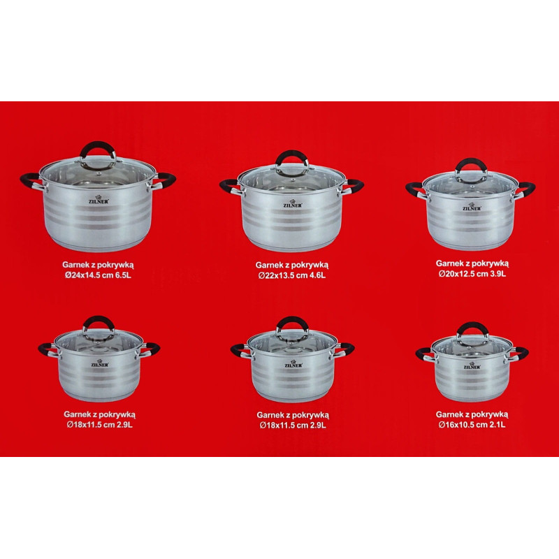 12 częściowy komplet garnków firmy ZILNER wykonany ze stali nierdzewnej. Stal chromowo-niklowa z której wykonany jest cały komplet jest nierdzewna, wytrzymała i długowieczna. Zastosowany materiał jest nie tyko najlepszy z możliwych, ale także świetnie się prezentuje i jest wyjątkowo łatwy w czyszczeniu oraz posiada właściwości bakteriobójcze. Naczynia w komplecie są z zewnątrz satynowe (posiadaja błyszczące paski) oraz błyszczące wewnątrz. Ferromagnetyczne 5-warstwowe dno akutermiczne (5mm) z warstwą aluminiową gwarantuje doskonały rozdział i magazynowanie ciepła. Wszystkie garnki z kompletu można używać na wszystkich rodzajach kuchenek, również nakuchni indukcyjnej. Nitowane uchwyty (polerowane) z okładzinami silikonowymi. Na wewnętrznej stronie każdego garnka znajduje się praktyczna miarka. Przyzwoite, umiarkowanie ciężkie garnki działające na indukcji, za bardzo atrakcyjną cenę.