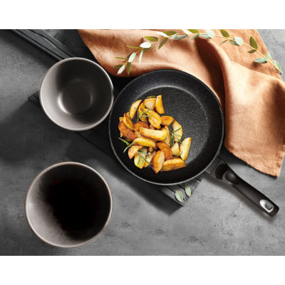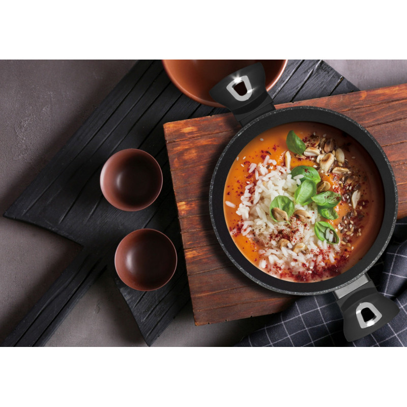 Granitowa powłoka sprawia, że naczynia są wyjątkowo odporne na wszelkie zarysowania i trwałe. Ten typ garnków i patelni pozwala również na smażenie przy użyciu minimalnej ilości tłuszczu, ponieważ naczynie rozgrzewa się podobnie do kamienia i oddaje ciepło całą swą powierzchnią.