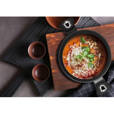 Kompozycja aluminiowego korpusu i ferromagnetycznego dna umożliwia użytkowanie na kuchni indukcyjnej oraz na wszystkich innych rodzajach kuchni i wykorzystywania najlepszych właściwości akutermicznych odlewanego i kutego aluminium na wszystkich kuchenkach i płytach grzewczych. Możliwość gotowania/smażenia w temperaturze do 220°C.