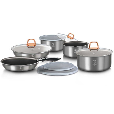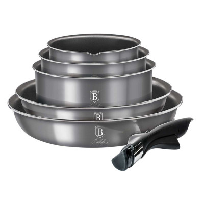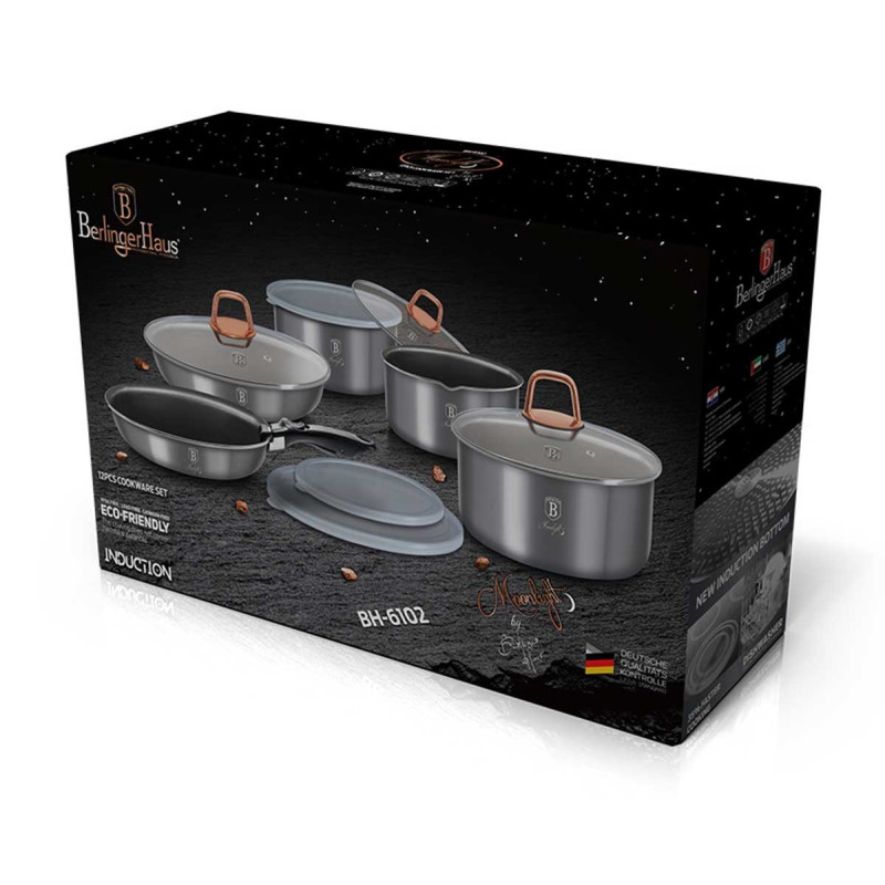 Najwyższej jakości zestaw garnków aluminiowych 12 ele. BERLINGER HAUS z serii MOONLIGHT z unikalną powłoką tytanową oraz odpinaną rączką w systemie Click it. Przystosowane do wszelkiego typu kuchenek, także do indukcyjnych.