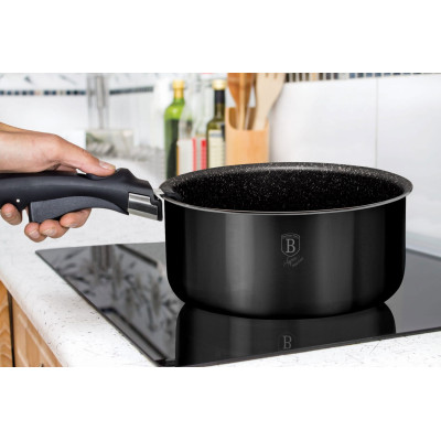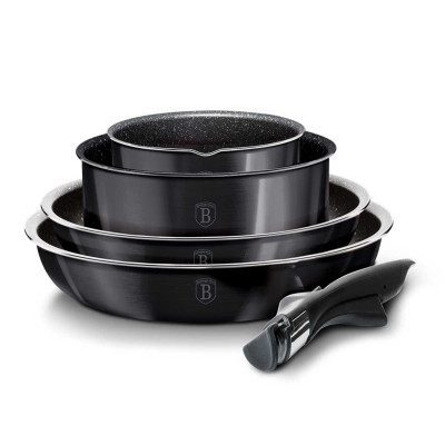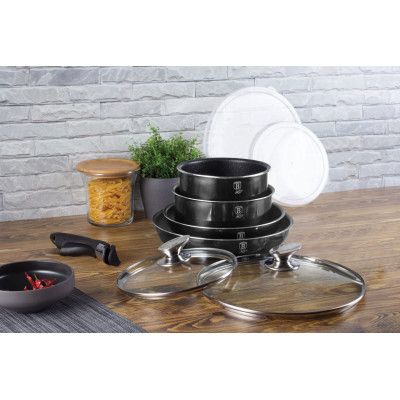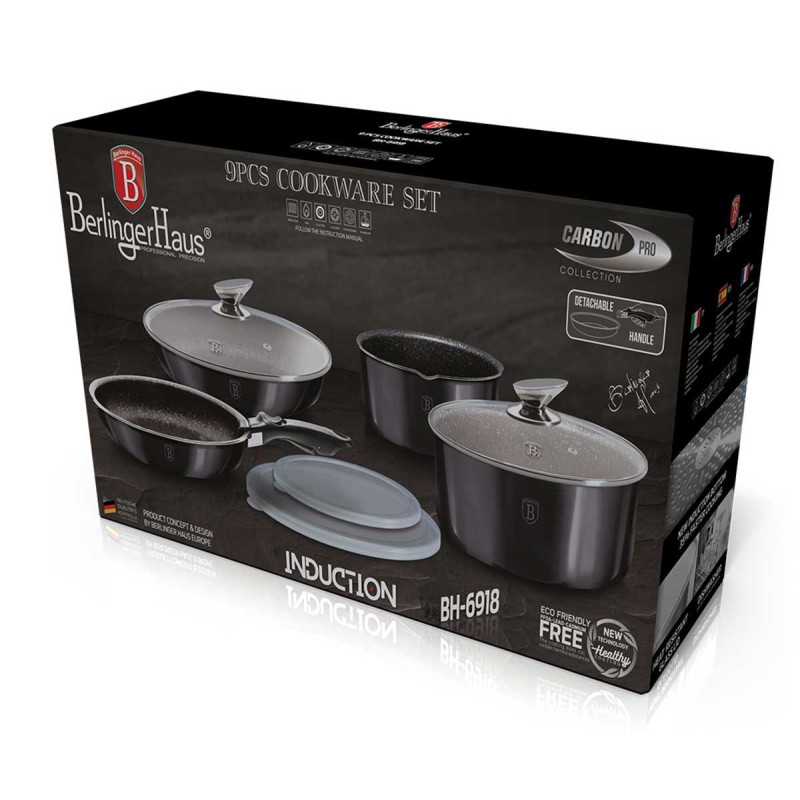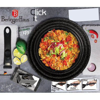 9 elementowy zestaw garnków aluminiowych CLICK & COOK z powłoką granitową oraz odpinaną rączką w systemie Click it renomowanej marki BERLINGER HAUS z serii CARBON PRO Metallic Line.