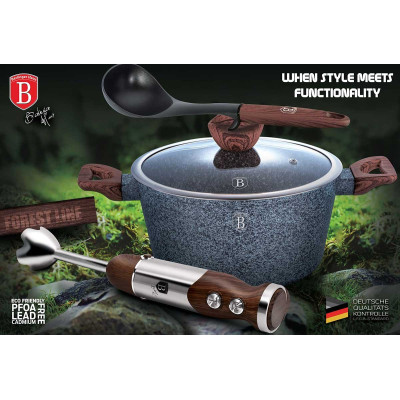 4 częściowy zestaw naczyń kuchennych firmy BERLINGER HAUS z kolekcji FOREST LINE. Garnek Ø24 i patelnia Ø24 cm, szklana pokrywka pasująca do obu naczyń oraz pokrywka szczelna z elastycznego tworzywa pozwalająca zabezpieczyć przechowywaną potrawę.