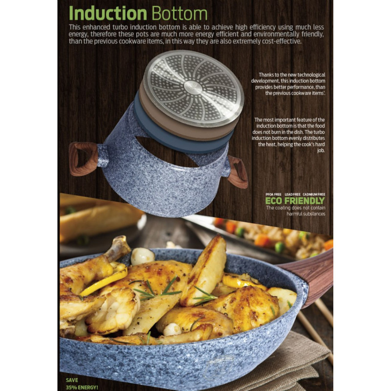 Kompozycja aluminiowego korpusu i ferromagnetycznego dna umożliwia użytkowanie na kuchni indukcyjnej oraz na wszystkich innych rodzajach kuchni i wykorzystywania najlepszych właściwości akutermicznych odlewanego i kutego aluminium na wszystkich kuchenkach i płytach grzewczych. Możliwość gotowania/smażenia w temperaturze do 220°C.