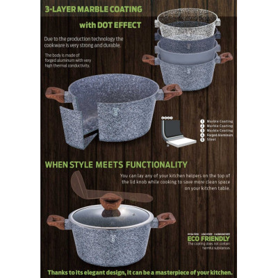 5 częściowy zestaw naczyń kuchennych firmy BERLINGER HAUS z kolekcji FOREST LINE. Garnek Ø24cm, garnek płaski Ø24cm i patelnia Ø24cm, szklana pokrywka pasująca do obu naczyń oraz pokrywka szczelna z elastycznego tworzywa pozwalająca zabezpieczyć przechowywaną potrawę.