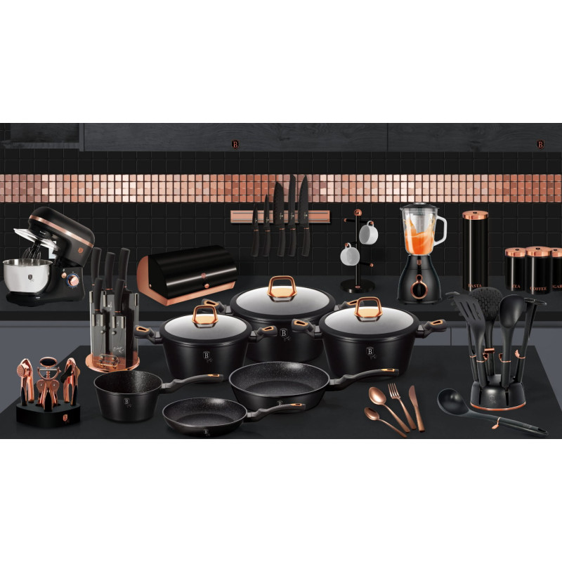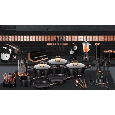Garnki i akcesoria z serii BLACK ROSE firmy BERLINGER HAUS wykonane są z wysokiej klasy kutego aluminium pokrytego wewnątrz potrójną powłoką granitową (marble) o bardzo wysokim współczynniku twardości. Powłoka zewnętrzna występuje w kolorze czarnym. Te atrakcyjne i modne naczynia wyposażone są standardowo w uchwyty typu SOFT TOUCH (silikon handle). Przystosowane do wszystkich rodzajów kuchenek: gazowa, elektryczna, ceramiczna, halogenowa, indukcyjna. System TURBO INDUCTION (bardzo szybko nagrzewają się) pozwala zaoszczędzić nawet 35% energii.