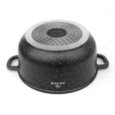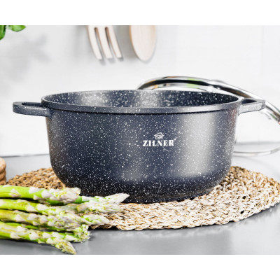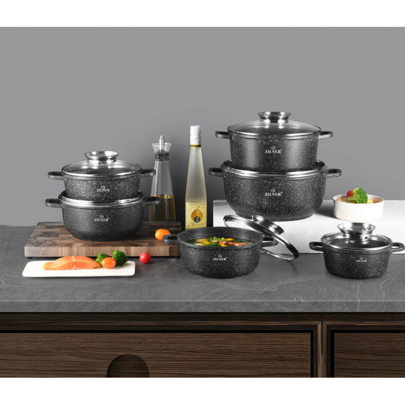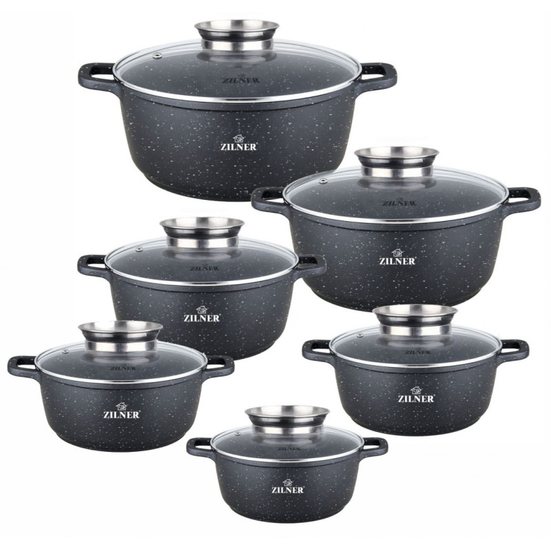 Wysokiej jakości zestaw 6 garnków marmurowych ze szklaną pokrywą. Wykonane z odlewu aluminiowego pokrytego marmurową powłoką nieprzywierającą. Produkt z wytrzymałą, nieprzywieralną powłoką marmurową pozwala na zdrowe, beztłuszczowe gotowanie i łatwe mycie, a przede wszystkim chroni jedzenie przed przypaleniem. Zastosowany materiał perfekcyjnie utrzymuje i przewodzi ciepło.