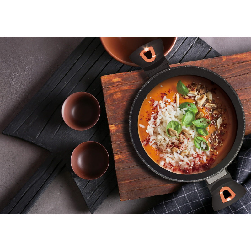 Kompozycja aluminiowego korpusu i ferromagnetycznego dna umożliwia użytkowanie na kuchni indukcyjnej oraz na wszystkich innych rodzajach kuchni i wykorzystywania najlepszych właściwości akutermicznych odlewanego i kutego aluminium na wszystkich kuchenkach i płytach grzewczych. Możliwość gotowania/smażenia w temperaturze do 220°C.