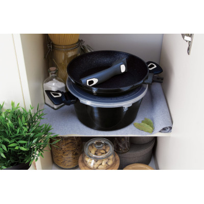 Kompozycja aluminiowego korpusu i ferromagnetycznego dna umożliwia użytkowanie na kuchni indukcyjnej oraz na wszystkich innych rodzajach kuchni i wykorzystywania najlepszych właściwości akutermicznych odlewanego i kutego aluminium na wszystkich kuchenkach i płytach grzewczych. Możliwość gotowania/smażenia w temperaturze do 220°C.