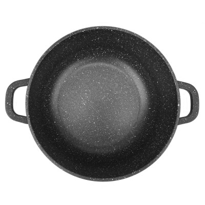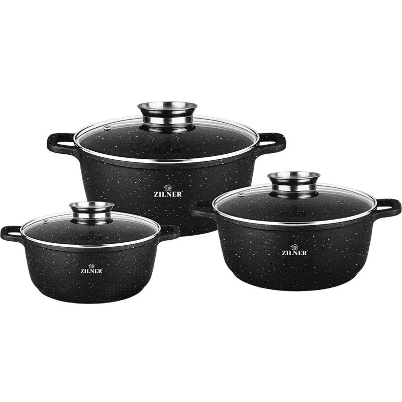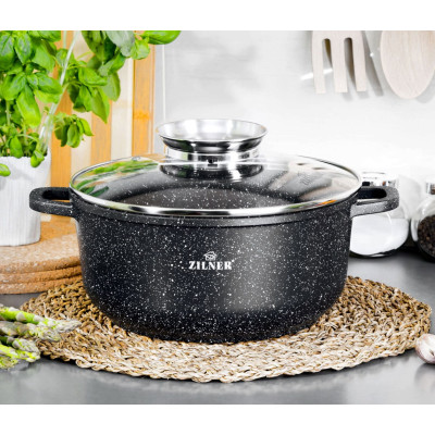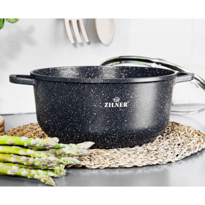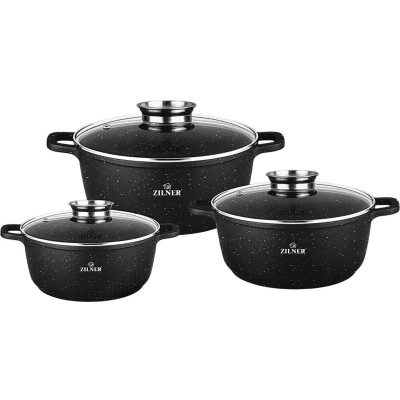 Zestaw 3 dużych garnków marmurowych typu "gastro" 10L + 13L + 18L z pokrywą z dozownikiem. Wykonane z odlewu aluminiowego pokrytego nieprzywieralną potrójną powłoką marmurowo-ceramiczną. Produkt pozwala na zdrowe, beztłuszczowe gotowanie i łatwe mycie, a przede wszystkim chroni jedzenie przed przypaleniem. Zastosowany materiał perfekcyjnie utrzymuje i przewodzi ciepło.