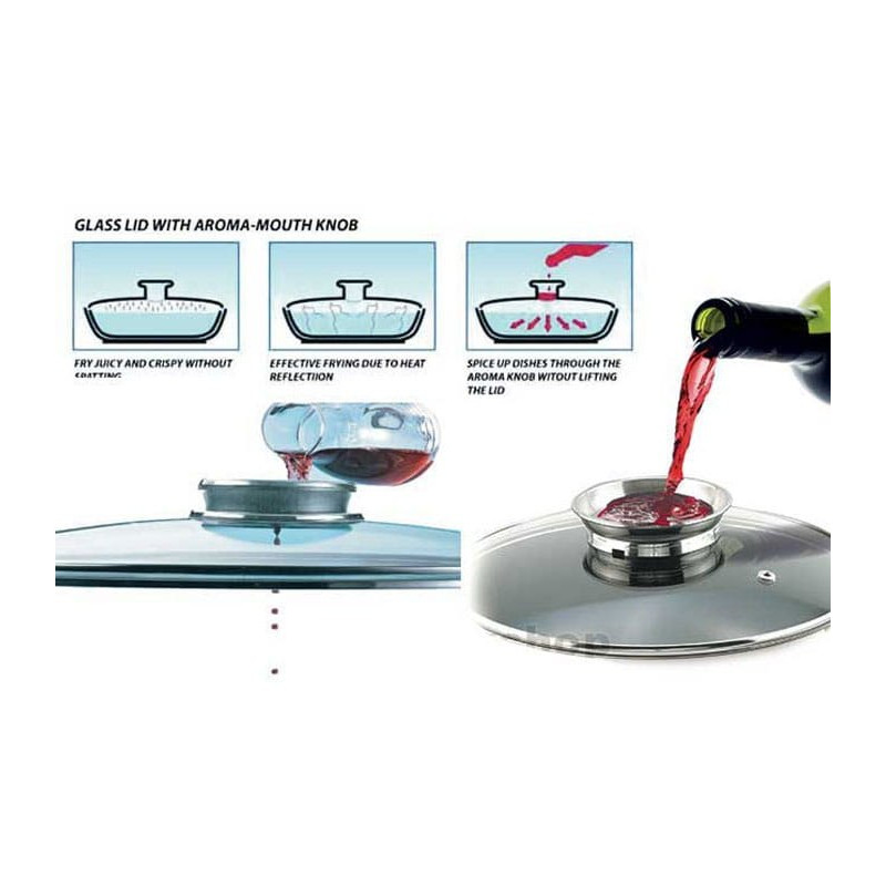 System Aroma Knob - Przejrzysta szklana pokrywa żaroodporna z uchwytem typu Aroma Knob jest odporna na stłuczenia i pozwala obserwować proces gotowania bez zdejmowania pokrywki. Dzięki innowacyjnemu uchwytowi z dozownikiem można w wygodny sposób dozować do wnętrza brytfanny olej lub oliwę np. smakową. Potrawa będzie dzięki temu soczysta i nie przypali się.