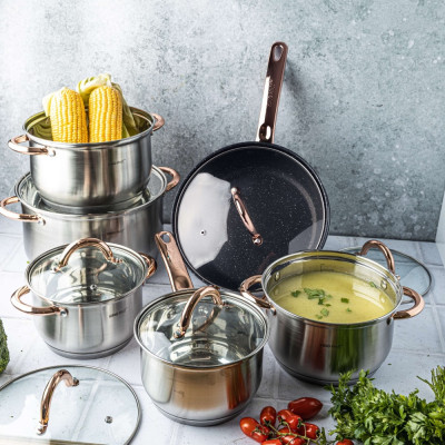 Wszystkie garnki z kompletu można używać na wszystkich rodzajach kuchenek, również nakuchni indukcyjnej.