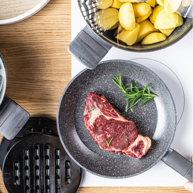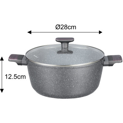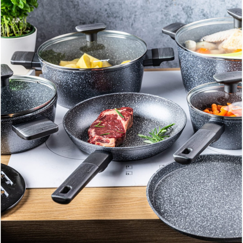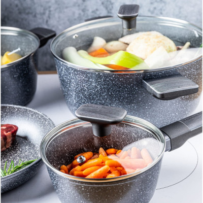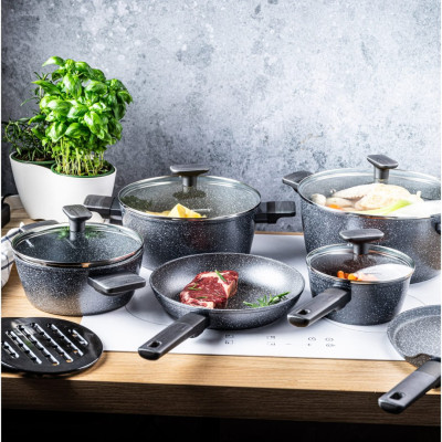 Marmurkowa powłoka sprawia, że naczynia są wyjątkowo odporne na wszelkie zarysowania i trwałe. Ten typ garnków i patelni pozwala również na smażenie przy użyciu minimalnej ilości tłuszczu, ponieważ naczynie rozgrzewa się podobnie do kamienia i oddaje ciepło całą swą powierzchnią.