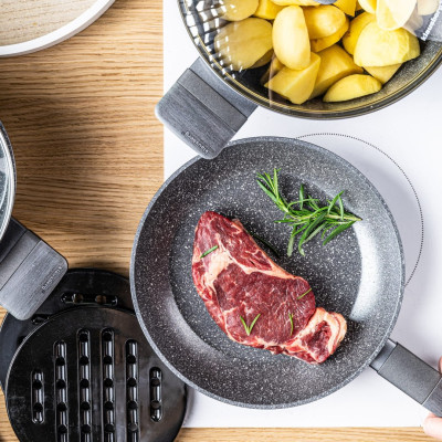 Marmurkowa powłoka nieprzywierająca, umożliwia smażenie przy użyciu minimalnej ilości tłuszczu.